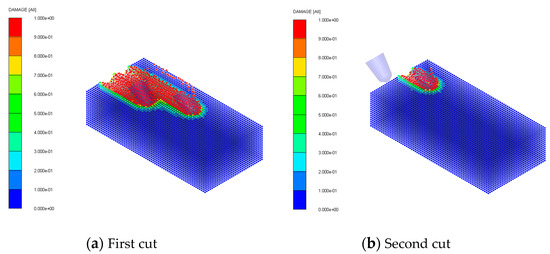 In this numerical analysis, the crack propagation and fragmentation behavior of rock were represented by the damage level of each particle. In rock cutting, damage and fragmentation of the rock occur in the area between adjacent cutters and in the area of contact with the cutters. At the point of contact with the pick cutter, the rock fragmentation and stress distribution are affected by the penetration depth, whereas the rock fragmentation pattern between adjacent cutters depend on the cut spacing.