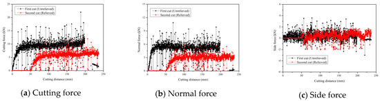 In addition, the numerical results clearly showed that there was a significant difference in the cutter forces between the relieved cutting and unrelieved cutting modes. The cutter forces of unrelieved cutting were significantly larger than those of the relieved cutting mode in numerical simulations. The results showed that the cutting conditions (i.e., cut spacing and penetration depth) affected the cutter forces. This indicated that the changes in the cutter force owing to the interaction between the adjacent picks was properly simulated in the numerical simulation.