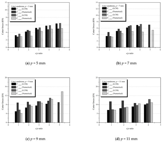 The relative errors in the cutter forces differed with the penetration depth. At 5 mm, the numerical simulation slightly underestimated both the cutting force and the normal force compared with the LCM test. The relative errors in the cutting force and normal force between the LCM and numerical simulation were 13.5% (7.5–21.5%) and 21.3% (16.7–31.1%). As the penetration depth increased to 7 mm, the numerical simulation slightly overestimated the cutting force and underestimated the normal force compared with the LCM test. The relative errors of the cutting force and normal force between the LCM test and numerical simulation were 15.7% (5.6–36.0%) and 20.0% (5.7–33.8%), respectively. At 9 mm, the numerical simulation overestimated the cutting force of a pick cutter. The maximum relative error of the cutting force was 76.4% when the cut spacing was 9 mm. The relative errors of the cutting force and normal force between the LCM test and numerical simulation were 38.9% (16.4–76.4%) and 11.7% (4.5–27.5%). At 11 mm, the numerical simulation significantly overestimated the cutting force at cut spacings of 11 mm and 22 mm. The relative errors at these cut spacings were 69.0% and 54.3%, respectively. However, the normal force of the numerical simulation showed good agreement with the LCM test results for all cut spacings.