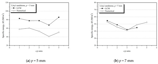 This study also aimed to compare the SE from the numerical simulation with that from the LCM test. As mentioned previously, the SE is a representative index of cutting efficiency. As described in Equation (1), it is calculated by the cutting force and cut volume of the rock during the rock cutting process. Therefore, the result of specific energy is important for assessing the applicability of the numerical simulation. For comparison, Table 5 summarizes the results of the numerical simulations and the LCM tests.