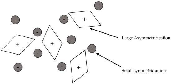 Ionic liquids (ILs) consist of an organic cation and an anion (organic or inorganic); both serve as solvents and supporting electrolytes, thereby making them an attractive alternative to toxic solvents or aqueous solutions in the electroplating industry. Figure 1 shows the schematic arrangement of an IL representing a large, bulky asymmetric cationic component and a relatively small symmetric anion []. The highly asymmetric structure of the cation makes it difficult to stack with the anions close to each other, and reduces the lattice energy, thus effectively prohibiting IL’s crystallization and lowering its melting point. ILs distinguish themselves from traditional molecular liquids in terms of their mass transport and charge transport.