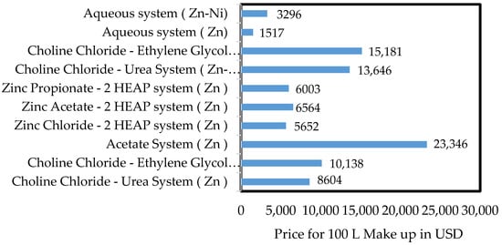 If ILs are to be employed for electrodeposition on a larger (industrial) scale, the effect of impurities either emanating as a byproduct from the synthesis of ILs or traces of water in the form of drag-out needs to be considered. Adopting the ionic liquid-based system on an industrial scale for electroplating applications requires suitable recycling and disposal methods [,]. Though the non-volatile nature of the ILs makes them attractive for electroplating applications, there are certain issues associated with them when employed at industrial scale. In addition, the high viscosity of ILs affects the mass transportation of the species, which leads to the low mobility and diffusion coefficient of metal ions. Therefore, the design and preparation of ILs with the desired physical and chemical properties such as viscosity, stability, conductivity, and composition require a significant effort. Furthermore, ionic liquids cannot be easily purified by conventional methods such as distillation. An additional issue that might arise during the scale up is the heat capacity of the ionic liquids. On the basis of the work reported by Waliszewski et al. [], the heat capacity values of imidazolium and pyridinium salts were in the range of 300 to 600 J K−1mol−1, indicating that that the ILs might actually have to be cooled rather than heated. Another disadvantage with the use of some ionic liquids is that they may suffer from ohmic heating, owing to their low electrical conductivity during electroplating. Research on ILs the field of electroplating technology has expanded significantly over the past decade. Once the technical performance of an ionic liquid is fully demonstrated, it becomes obvious that, at a certain point, the price determines the final commercial success of a product as it decides the economic feasibility of the IL-based system or process. At that point, a good marketing strategy is to explain that the higher costs of using ILs also bring added value. Any available cost analysis for a given plating system is usually based upon academic research, because of the trade secrets and commercial sensitivity involved in the proprietary electrolytes developed by industries and commercial organisations. Thus, the cost discussions on Zn and Zn–Ni alloys are based upon the information available in the literature on non-commercial electrolytes used by various science and engineering research laboratories. It is, however, worth noting that most of the academic work is primarily initiated after conducting a survey of literature and discussions with commercial electroplaters. Figure 2 shows the cost comparison of ionic liquid-based systems against aqueous electrolytes considering an industrial scale of 100 L make up. The cost is calculated considering the quantity of individual constituent components required for the IL-based system from the references [,,,,] and the value of each constituent is calculated based on the Sigma-Aldrich and Merck pricing. From Figure 2, ILs seem uneconomical compared with traditional aqueous and organic solvents owing to their high cost, which greatly prohibited their applicability on a large scale. However, it is worth noting that recycling the drag out solution (process solution transferring into subsequent rinse water tanks) shall enhance the life of the ionic liquid-based plating solution, saving cost while eliminating the environmental impact of the process due to the drag out (reducing the source of pollutants). The plating solution and the rinse water can be recycled many times without affecting the quality of the coatings formed, as long as the contamination level is closely monitored. After performing Zn and Zn–Ni alloy plating using ionic liquid-based systems, a film of the bath solution will remain on the parts, the rack, or barrel and remain in cavities and gaps owing to their high viscosities []. Hence, corresponding measures should be taken to tackle the problems mentioned above and a key objective of future research should focus on not only reducing the cost of the ILs, but also minimizing the practical problems associated with the process. The scope of ionic liquids in the electroplating process of Zn/Zn–Ni alloys for aerospace applications depends on its impact on the environment.
