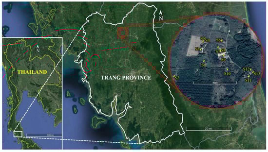 Locations of the homes sampled in an area of Trang Province in Thailand.