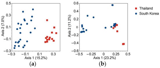 Principal coordinate analysis plots based on the fungal internal transcribed spacer 1 (ITS1) operational taxonomic units (OTUs) at a 97% sequence similarity. The results of this study (Thailand) were compared with the results of An and Yamamoto’s South Korean study []. (a) Fungal assemblage memberships in terms of Jaccard similarity coefficients and (b) fungal assemblage structures in terms of Yue and Clayton theta (θ) similarity coefficients.