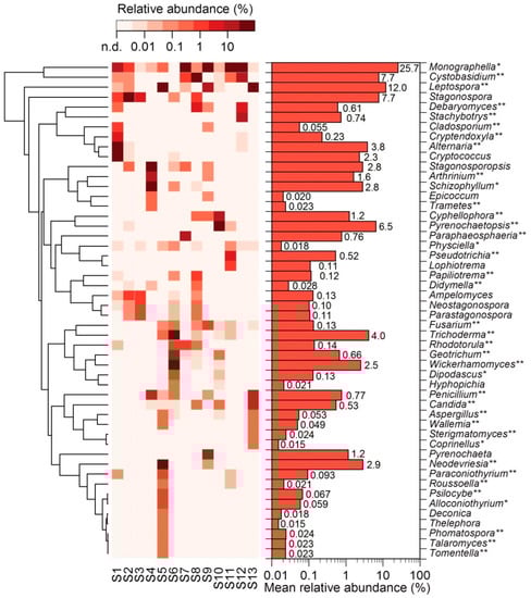 Relative abundances at the genus level. The 50 most abundant genera are shown. The tree represents between-genus similarity of log-transformed relative abundances based on Euclidean distance. Double asterisks (**) indicate genera detected against both the UNITE and RefSeq databases. Single asterisks (*) indicate genera detected only against the UNITE database that were absent in the RefSeq database. The genera without asterisks are those detected only against the UNITE database, even though they were present in the RefSeq database. n.d.: not detected.