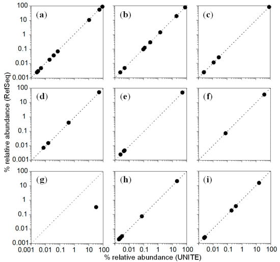 Relative abundances of the nine most abundant genera detected against both the UNITE and RefSeq databases. (a) Leptospora, (b) Cystobasidium, (c) Pyrenochaetopsis, (d) Trichoderma, (e) Alternaria, (f) Neodevriesia, (g) Wickerhamomyces, (h) Arthrinium, and (i) Cyphellophora. Dashed lines indicate 1:1 ratios.