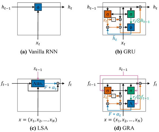 The attention mechanism we propose in this work, GRA, is a gated recurrent variant of the LSA []. The recurrences in the vanilla RNN, GRU, LSA, and GRA are illustrated in Figure 2 for comparison. The GRU is designed to update the recurrent hidden state to be a weighted average of the previous recurrent hidden state and the candidate recurrent hidden state with the update gate , which is a function of the input at time t and the previous recurrent hidden state as in Equation (1). Similarly, in Equation (16), the GRA updates the recurrent state to be a weighted average of the previous recurrent state and the convolved alignment with the update gate , which is a function of the query, key, and the previous recurrent state . The candidate recurrent hidden state in Equation (3) is a function of the input at time t and the multiplication of the previous recurrent hidden state and the reset gate , which is computed by Equation (4). The score in Equation (15) is a function of the query, key, and the product of the previous recurrent state , which comes from the previous alignment , with the scoring gate .