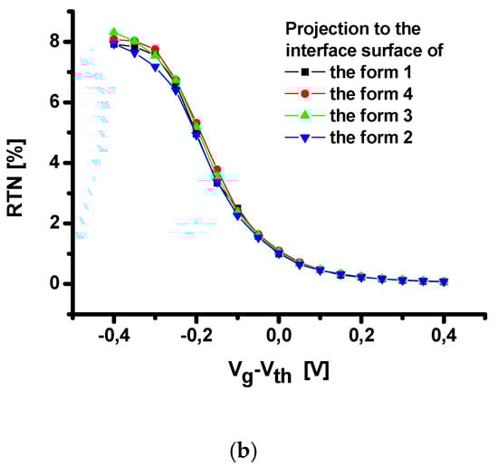 - Asenov, A.; Balasubramaniam, R.; Brown, A.R.; Davies, J.H.; Saini, S. Random Telegraph Signal Amplitudes in Sub-100 nm (Decanano) MOSFETs: A 3D “Atomistic” Simulation Study. In Proceedings of the International Electron Devices Meeting, San Francisco, CA, USA, 10–13 December 2000; pp. 279–282. [Google Scholar]