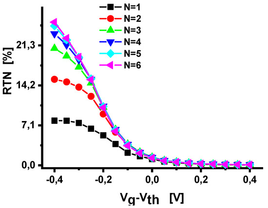 - Campbell, J.P.; Yu, L.C.; Cheung, K.P.; Qin, J.; Suehle, J.S.; Oates, A.; Sheng, K. Large Random Telegraph Noise in Sub-Threshold Operation of Nano-Scale nMOSFETs. In Proceedings of the 2009 IEEE International Conference on IC Design and Technology, Austin, TX, USA, 18–20 May 2009; pp. 17–20. [Google Scholar]