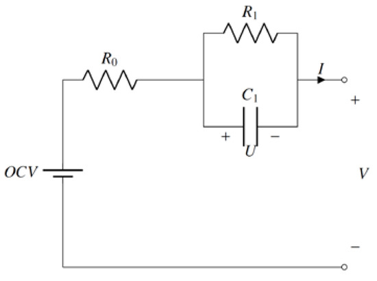 This model is extensively described in the literature; for example, by Hu et al. [35], where the Thevenin model uses hysteresis. A more traditional formulation can be found in Mansour et al. [36], which uses it for the state of charge (SoC) for NMC estimation with adaptive filters, Xiong et al. [37], or Zheng et al. [38].