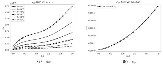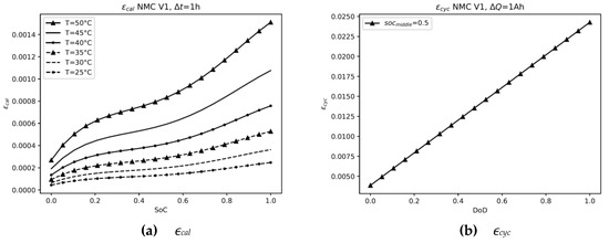 Figure 4a shows as a function of the SoC for a range of cell temperatures from 25 to 50 °C, and Figure 4b shows as a function of the DoD.