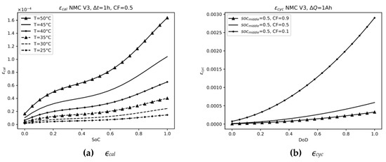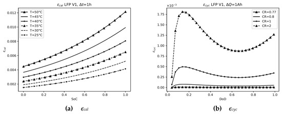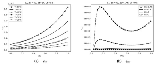 Figure 3a shows as a function of the SoC for a range of cell temperatures from 25 to 50 °C, and Figure 3b shows as a function of the DoD for CR values of 0.77, 0.8, 1, and 2.