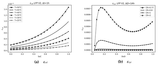 Figure 5a shows as a function of the SoC for a range of cell temperatures from 25 to 50 °C, and Figure 5b shows as a function of the DoD for CR values of 0.77, 0.8, 1, and 2.