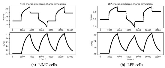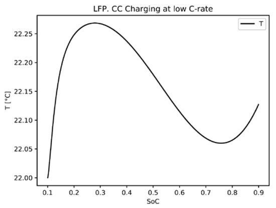 Another study on heat generation is Balasundaram et al. [42], which tests the temperature model on an LFP cell. Song et al. [31] use entropy variation, based on a Forged et al. [43] study that calculates the internal temperature of an LFP/graphite 26,650 cell depending on surface temperature and ambient temperature.