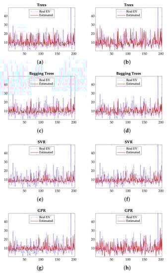 Representation of actual values for operational normalized EVs (in blue) and estimated EVs based on developed ML methods (in red), when using endogenous normalized variables (left panels) and both for endogenous normalized and exogenous variables (right panels). The benchmarked algorithms were decision trees (a,b), bagging trees(c,d), SVR (e,f), and GPR (g,h).