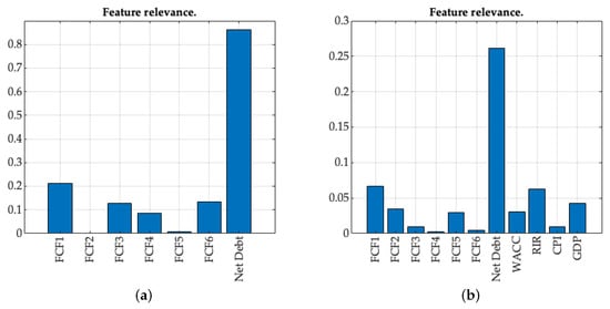 Once confirmed that neither the incorporation of double normalization nor the addition of complex, generally accepted, subordinated variables incremented the classification or regression capabilities of the implemented methods, we evaluated subsets of variables. The aim was to define a computationally low-complexity model by choosing the features that consistently showed greater relevance when decision trees were evaluated, although not in all realization and methods in the same order: first year FCF, net debt, GDP and RIR. An illustrative example of this relevance is presented in Figure 2 for only endogenous (a), and for both endogenous and exogenous (b) variables. The results of this simulation, presented in the last column of Table 4 (Key Features column), showed that the exclusive use of the four most significant variables either slightly worsened or matched the results obtained in the base case scenario considering endogenous and exogenous operationally normalized variables.