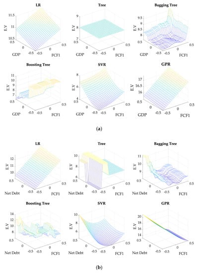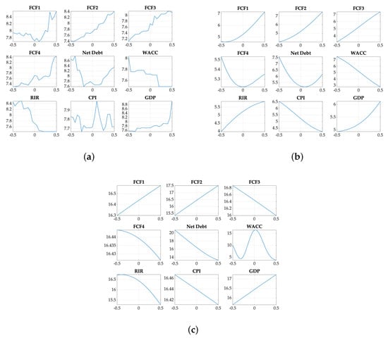 Figure 3 shows the local trend of widely understood key variables, for a better performing method (BagTree, SVR and GPR). The abscissa axis corresponds with the double-normalized variables, and the ordinate axis represents the operationally normalized output, EV/EBITDA. Visual inspection of these charts are recurrently coherent with expected trends, as the output showed a positive response versus the different FCF, CPI and GDP, whereas this response was inverse versus net debt, WACC and RIR. Individual exceptions were found in certain realizations and for a limited number of variables. In that direction and from illustrative proposes, the outcomes depicted in these figures, acknowledged this reality for variable RIR in Figure 3b and FCF3 and WACC in Figure 3c.