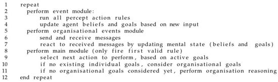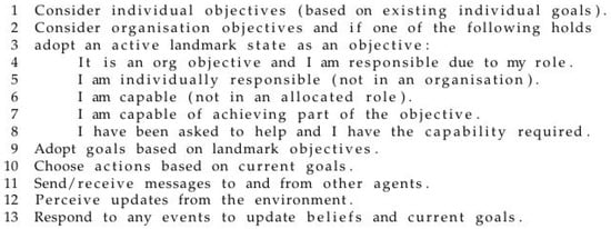 We use the BDI architecture in a MAS setting where organisations are explicit; cf. [17,18,19,20]. An organisation comprises multiple agents who share an organisational goal, while holding individual beliefs, etc., and each agent has specified capabilities that can contribute toward reaching the organisational goal state or sub-states toward achieving that goal. Our agents are organisationally adept [17] in that they are aware of the organisation structure, can reason at the organisation level, and can adjust their behaviour for operational decision-making in keeping with known organisational guidelines (here, policies). We limit attention to cooperative and compliant agents and use the organisation construct to specify relationships and obligations between agents. We do not consider sanctions or penalties if agents do not adhere to an organisation’s policies, although these are important in open systems.