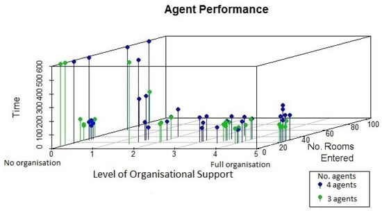 The level of organisation awareness that agents in OJAzzIC possess is a distinguishing feature. When agents are not part of an organisation (level 0), the agents’ performance is not as good in terms of time or activity (rooms entered). OJAzzIC agents know who else is in the organisation and this awareness enables focused interactions to coordinate beliefs and intentions. Agents in the OJAzzIC MAS organisation directly communicated with each other in order to complete the rescue scenario effectively. Policies obligated the agents to share beliefs and intentions, so there was some efficiency in the rescue approach. When a medic agent was informed that another pair of agents was committed to complete a particular rescue, then that medic agent dropped any individual intentions to complete and potential intentions to consider that same rescue. This feature improved agent efficiency. That agent moved on to different rescues. The number of rooms entered dropped when agents shared beliefs and intentions because there was no duplication of effort.