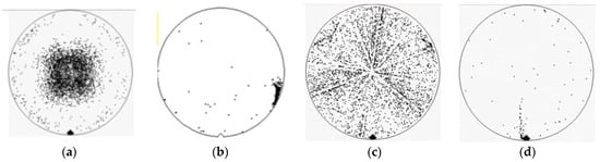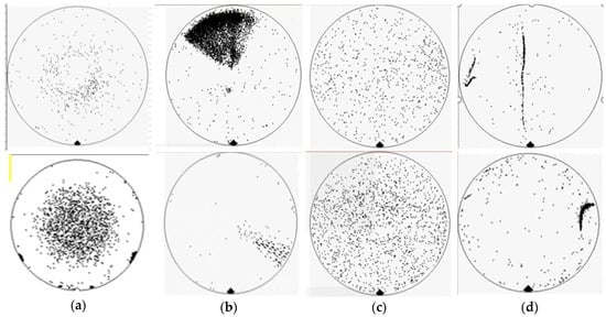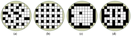 Figure 2. Wafer defects: (a) random defect, (b) repeatable defect, (c) systematic defect, and (d) combinational defect. - Type-B defects are systematic and repeatable from wafer to wafer. This type of defect has obvious clustering phenomenon, as shown in Figure 2b,c. The cause of this type of defect can usually be found by the distribution of defects on the wafer, which is used to find abnormalities in the process or machine, such as the misalignment of the mask position during photo development or excessive etching during the process, etc.