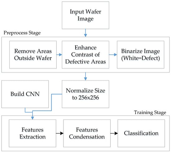 The system flowchart for the training portion of the primary method being investigated is shown below in Figure 4. In this initial study, 25,464 raw images with visible defects were collected online from the WM-811K [13] dataset, which contains 811,457 semiconductor wafer images from 46,393 lots with eight defect labels. Based on experiments performed in this paper, a few wafer images exhibit multiple types of defects and have only a single label: this is a limitation of this dataset. From this dataset, only images with visible defects were chosen for the purpose of this paper. However, these wafer images were acquired from different lots with different image acquisition methods, so the raw images do not have a uniform definition of defects. For the purpose of this investigation, a uniform definition would be better. So for uniformity, each raw image is preprocessed to extract only the area containing the wafer by blackening the image areas outside the wafer to remove them from consideration. Then, the contrast of the wafer area is enhanced before being binarized using threshold(s) obtained via the OTSU [14] algorithm. The purpose of binarization is to emphasize the defects. This operation is then followed by redefining the areas without defects as having the same grayscale value, while the defects are redefined using white pixels. The final step is to normalize the image to 256 × 256 pixels, while making sure that no white pixel is unintentionally removed by the normalization. About 75% of all the normalized images are used to train the convolution neural network, which include features extraction, features condensation, and classification. After training, about 25% of the normalized images are used for testing, and an additional 40 images are used for validation. For this paper, all 25,464 wafer images were labeled, 19,112 images were randomly chosen from each of the four types for training: center: 4464, local: 4680, random: 5928, scrape: 4040. These four classes were grouped from the eight defect labels in WM-811k due to similarities in the causes of the defects. The number of wafer images chosen for testing is 6312, and 40 images, 10 from each type of defect, were reserved for validation. The other method we investigated in this paper is the use of transfer learning on pretrained faster R-CNN models, which will be discussed later.