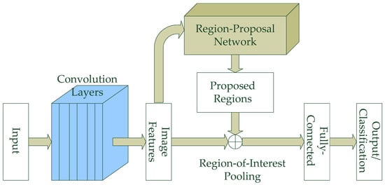 The training of a CNN network takes a long time, especially with a large dataset. In this paper, we also investigated whether the training time can be reduced by using the transfer learning technology on pretrained deep learning neural networks. For this purpose, a special type of CNN, the faster R-CNN [18], is chosen. Faster R-CNN is a variant of the CNN deep-learning neural network first proposed to address the object detection problem. It differs from the standard CNN network shown in Figure 5 by the addition of a detection network for a set of possible regions containing objects by forming bounding boxes at different scales, which is termed the region proposal generation network. The block diagram of a faster-R-CNN network is illustrated in Figure 6.
