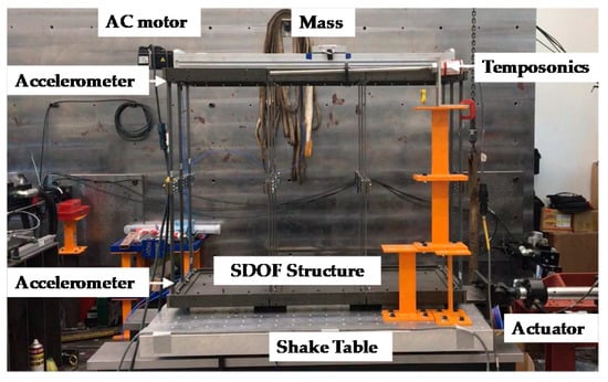 The machine learning based optimal control performance was evaluated by conducting shake table testing in the small-scale structural laboratory located in National Center for Research on Earthquake Engineering (NCREE) in Taipei, Taiwan [21]. Figure 11 shows the experimental setup. A single-degree-of-freedom (SDOF) shear building specimen made of aluminum alloy was designed and fabricated for experimental validation. The weight of the specimen was 450 N. The AMD installed on the top of specimen was composed of an AC motor, a guide screw, and a mass block. The weight of the mass block was 20 N, which was 4.4% weight of the specimen. The entire structural system was fixed on a rigid bottom plate, which was installed on the rigid platen of a shake table. The shake table was driven by a dynamic servo-hydraulic actuator with maximum stroke and force capacity of ±127 mm and ±15 kN, respectively. The dimension of the rigid platen made of aluminum was 1000 × 800 mm. An MTS FlexTest® Controller FT-100 digital controller, manufactured by MTS Systems Corporation, Eden Prairie, MN, USA was used to control the actuator using a proportional-integral-derivative control algorithm. An analog controller converted voltage into current was used to control the torque of the motor. Three high-resolution MEMS accelerometers manufactured by Silicon Designs, Inc., Kirkland, WA, USA were installed on the bottom rigid plate connected to the shake table, the roof of specimen, and the mass block to measure the absolute acceleration. Each accelerometer was able to measure a range of acceleration of ±20 m/s2. Note the control force of AMD was obtained by multiplying the mass of the mass block by the absolute acceleration measured from the accelerometer. Meanwhile, a Temposonics GH linear-position sensor, manufactured by MTS Systems Corporation, Eden Prairie, MN, USA was installed between the roof and the platen of shake table to measure the relative displacement of the specimen.