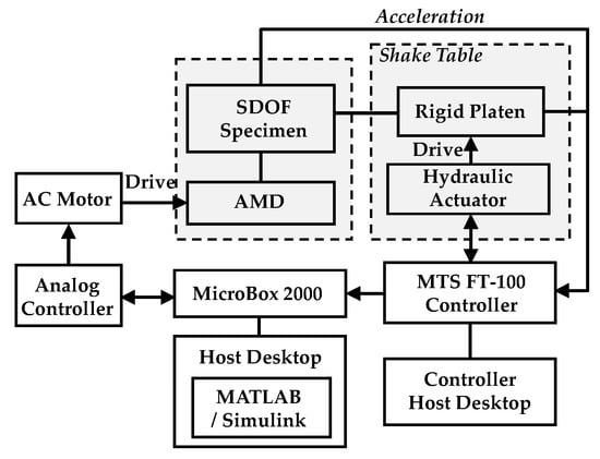 In order to implement the controller of AMD, a Micro-Box 2000 developed by TeraSoft Inc., Taipei, Taiwan was adopted which provided multi-function platform for rapid control prototyping applications. Three controllers were designed and implemented including the LQR-SOS, MLP-150, and ARX. The three controllers were built on the host desktop using MATLAB/Simulink and connected to I/O hardware with blocks provided by Simulink Real-Time. Executable C-code was compiled and downloaded onto the Micro-Box 2000 to run the control application. Meanwhile, the LQR-SOS required structural states for feedback control which were not measurable during the tests. As a result, a Kalman filter was essential to estimate the structural states for feedback control. In addition, the MLP and ARX took the measured acceleration as the input to calculate the control force. However, the acceleration measurement contained noise which could result in high-frequency control force and enlarge the acceleration response. Therefore, a 4th-order elliptic low-pass filter with a cutoff frequency of 15 Hz was designed. Both the Kalman filter and the low-pass filter were implemented using MATLAB/Simulink. The hardware and software layout for the experimental validation is depicted in Figure 12. The MATLAB/Simulink program was converted to C code and executed in Micro-Box 2000 which was running in real time. The shake table controlled by the MTS FT-100 controller excited the specimen. The seismic response of the specimen was measured and sent to the Micro-Box 2000 by the MTS FT-100 controller. Then the control force was calculated in real time and sent to the analog controller to drive the AMD. The mass block movement provided the inertial force which was equivalent to the achieved control force imposed on the specimen. The entire closed-loop control was repeated until the ground acceleration ended.