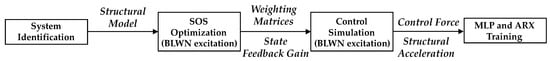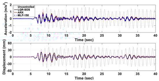 System identification of the SDOF shear building specimen was conducted prior to designing the LQR for the AMD. The identified natural frequency and damping ratio of the specimen were 0.905 Hz and 0.25%, respectively. The SOS metaheuristic optimization approach was applied to minimize the objective function as exposed in Equation (12). Since the specimen had only single degree-of-freedom, the Equation (12) became to minimize the peak absolute acceleration of the specimen. The procedure of design of LQR as well as training of MLP and ARX models for the experiments are illustrated in Figure 13. During the optimization of weighting matrices using SOS, a BLWM with a PGA of 0.8 m/s2, a bandwidth from 0 to 15 Hz, and a duration of 140 s was used to excite the identified structural model with a time step of 0.005 sec. Accordingly, the weightings Q and R in the cost function shown in Equation (6) were optimized and the optimal value of Q and R were 1.8357 and 100, respectively in the experimental validation. Accordingly, the state feedback gain Kg was obtained as [−0.2393, 0.1329]. Afterwards, the structural model was subjected to the band-limited white noise excitation again and the control force and structural acceleration were obtained. Then, MLP with 150 steps of acceleration (MLP-150) and the ARX controllers were trained offline using these data.