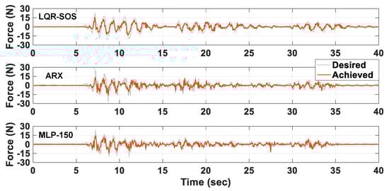 After training, the ARX model was also implemented in the control simulation model using MATLAB/Simulink as illustrated in Figure 10. The simulation configuration for the ARX model was identical to that for the MLP model. The corresponding RMSE between the desired and predicted control force in the control simulation model was 4.90%. Note that the RMSE of the ARX training result was approximate to those of the MLP training results. However, the RMSE in the control simulation model of the ARX model was larger than those of the MLP model with 120, 150, and 200 acceleration steps. This is because the series-parallel architecture was used in the training process and it was replaced by the parallel architecture in the control simulation. It is worth noting that the elapsed time for training the ARX model was merely 90 s. However, it took more than 1.5 h for training the MPL model with 120 acceleration steps. This is attributable to that the dimension of the ARX model (21 × 100 × 50 × 1) was significantly smaller than those of the MPL models (1210 × 300 × 300 × 300 × 1 for the case with 120 acceleration steps).