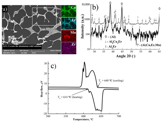The aluminium phase, the Al8Cu4Er phase in the fine eutectic, and the Al3Er phase were identified by SEM and X-ray diffraction analyses (Figure 1). During solidification, 1.6%Cu, 0.9%Mn, 0.3%Zr, and 0.2–0.3%Er were dissolved in the (Al) solid solution according to the point electron diffraction X-ray (EDX) analysis in SEM. As shown by the map element distribution (Figure 1a), the Cu-, Er-, and Mn-rich phases are presented in the as-cast microstructure. Unidentified peaks (marked with “?” in Figure 1b) were found in the XRD patterns. These peaks were not found in the XRD patterns of the alloy with the same composition without Mn addition (grey line in Figure 1b). These peaks probably correspond to the quaternary (Al,Cu,Mn,Er) phase. The atomic rotation of Cu/Mn/Er in this phase is 4/2/1 in accordance with point EDX SEM results. The possible compound Al25Cu4Mn2Er may match the quaternary (Al,Cu,Mn,Er) phase. The same morphology has an Al15(Fe,Mn)3Si2 eutectic phase [22,24].