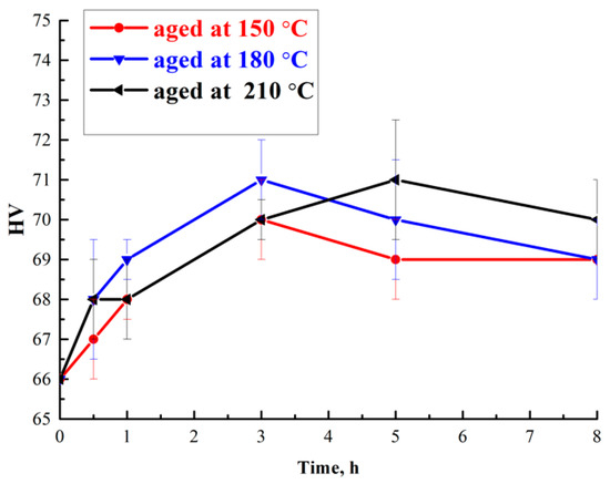 Hardness Vickers (HV) curves of the aged alloy at 150, 180, and 210 °C.