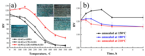 The ingot of the investigated alloy was quenched at 605 °C after homogenization treatment for 3 h, rolled to a 1 mm thick sheet, and annealed at different temperatures. The HV vs. temperature and time curves of the annealed alloy after rolling are shown in Figure 5. Figure 5a demonstrates the evaluation of HV after 1 h of annealing at 100–550 °C in comparison with that of the Al-6Cu-4.05Er [19] and Al-4Cu-2.7Er-0.3Zr [30] alloys. The investigated alloy has a high hardness due to the addition of manganese. Two processes can take place during the annealing of the as-rolled investigated alloy: softening and strengthening. Softening during low temperature after rolling proceeds due to a decrease of the dislocation density and formation of the substructure with low angular boundaries. The fine particles of the Al3(Zr,Er) and Al20Cu2Mn3 phases retard softening. Strengthening is promoted due to aging processes and the nucleation of metastable θ″(Al2Cu) precipitates. A deformed structure with a high density of dislocations and vacancies accelerates strengthening. The HV peak was found after 1 h of annealing at 150 °C (Figure 5a) and after 2 h of annealing at 150 °C (Figure 5b). Strengthening by θ″(Al2Cu) precipitates has a larger effect on material hardness than do softening processes at 150 °C. The hardness decreases by increasing the annealing temperature above 150 °C (Figure 5a). The hardness peak shifted to 0.5–1 h by increasing the annealing temperature up to 180 °C (Figure 5b). Softening has the largest effect on hardness at temperatures higher than 180 °C (Figure 5b). The recrystallization temperature of the alloy is in the range of 350–400 °C. A non-recrystallized grain structure was found after 1 h of annealing at 350 °C (inserted image in Figure 5a). The average grain size increased from 7.3 to 10.6 µm by increasing the annealing temperature from 400 to 550 °C (inserted images in Figure 5a).