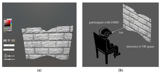 Virtual reality (VR) technology has been widely used as a research tool in psychological studies of visual perception over the last few decades [29,30]. One of the advantages of VR in psychological experiments is that it can display visual stimuli with controlled parameters in 3D. The impression of depth can be reproduced by presenting binocular vision cues using a head-mounted display (HMD) [31]. VR technology also provides an immersive environment for studies on multimodal sensory interactions [32,33,34].