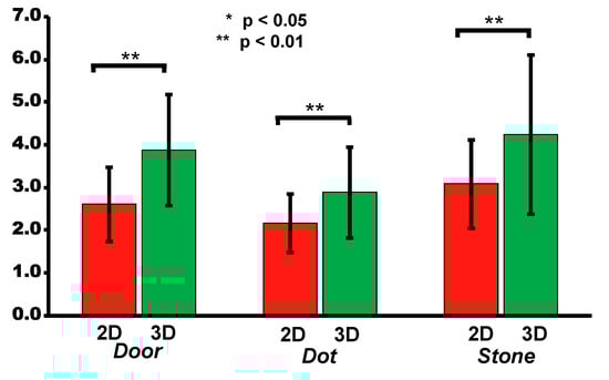 In our results, for door, a significant difference (p < 0.001, Cohen’s d = 0.934) was observed between the complexity scores in 2D (M = 2.60, SD = ±0.866) and 3D (M = 3.88, SD = ±1.301). For dot, a significant difference (p = 0.001, Cohen’s d = 0.769) was observed between the complexity scores in 2D (M = 2.16, SD = ±0.688) and 3D (M = 2.88, SD = ±1.054). For stone, a significant difference (p < 0.001, Cohen’s d = 0.863) was observed between the complexity scores in 2D (M = 3.08, SD = ±1.038) and 3D (M = 4.24, SD = ±1.855).