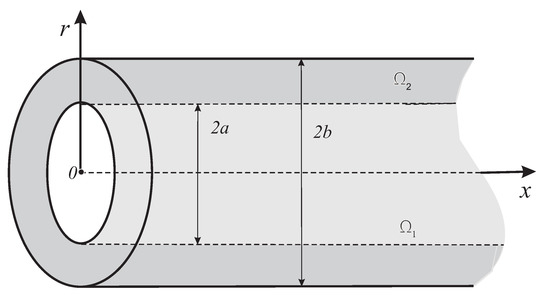 A porous medium considered consists of two parts: (1) macroporous cylindrical medium (macropore) with a radius a (i.e., region ), with large pores, characterized by a relatively high porosity and average fluid velocity in it, (2) surrounding cylindrical microporous medium (micropore) occupying the region , with low porosity (here and futher 1 stands for the macropore and 2 for the micropore) (Figure 1).