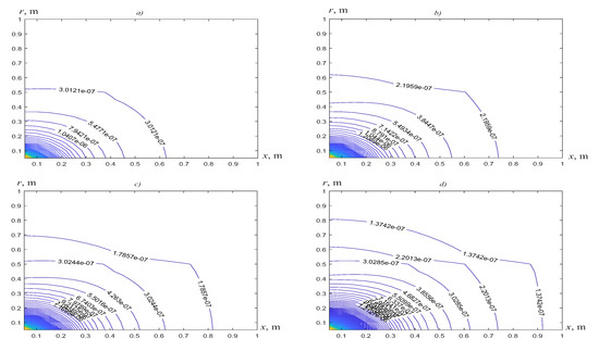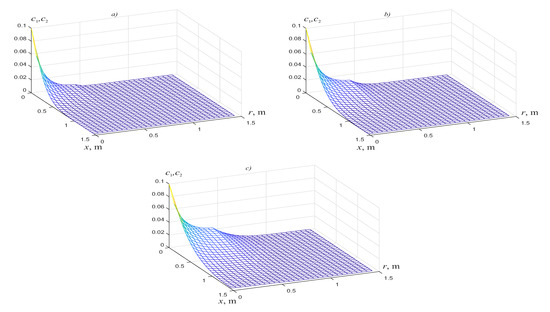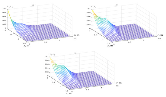 where —grid step in time, —grid step in x direction, —grid step in r direction, T—maximum time, during which the process is investigated, N—number of intervals along the radius in the macropore, L—length of cylinder, K—number of grid intervals in time, I—number of intervals along the length, J—number of intervals along the radius.