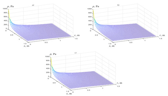 In Figure 2 and Figure 3 we present surfaces and p for the classic case, i.e., ignoring anomalous effects. It is easy to notice the spread of surfaces along the directions x and r. On the common border of the two zones, and , i.e., at one can observe a kink of surfaces, which means a discontinuity in concentration gradients on . It means that . This phenomenon is characteristic for macroscopically inhomogeneous media, where on the boundary of two media gradients of many characteristics break. One can notice the progress of the surfaces in the directions x and r with increasing the time t. The same phenomena occur with the pressure distribution (Figure 3).
