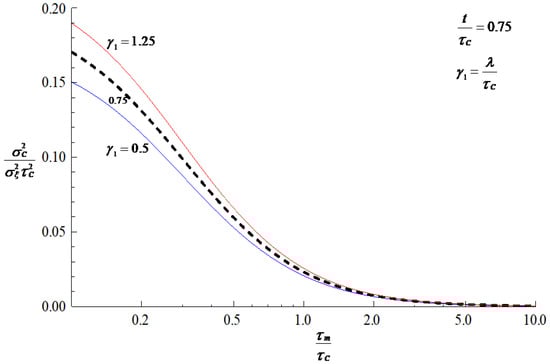 The variance of outflow concentration represented as function of τm is depicted in Figure 2 using Equation (24) for various values of λ/τC. The parameter τm apparently plays the role in smoothing out the concentration variability. This can be attributed to the reduction in the persistence of outflow concentration perturbation with τm which reduces the concentration variability. Here, the persistence is referred to the tendency for low values to be followed by low values and high values by high values. Additionally, from Figure 2, we see that for a fixed τm, an increase in λ results in higher variability of outflow concentration. A larger value of λ increases the persistence of inflow concentration and, in turn, the outflow concentration, leading to higher concentration variability.