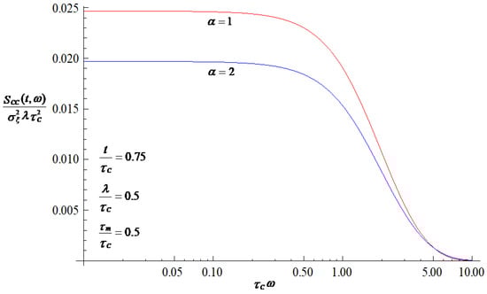 Figure 3 shows a comparison between the outflow concentration evolutionary power spectra given by Equations (23) and (26) at a given time. Evolutionary power spectra have the interpretation of decomposition of total energy (or the strength of the variations) over frequency at time t []. It is apparent from Figure 3 that high-frequency variations in the temporal input series are attenuated. A similar behavior is shown in Kirchner et al. [,] for the case of stationary outflow concentration time series. The figure also implies that the persistence of the concentration field is enhanced by a smaller value ofα. A smaller α will introduce greater variability in outflow concentration.