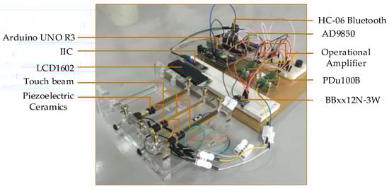 The piezoelectric haptic feedback actuator is shown in Figure 1, which includes the touch beam, LCD1602 liquid crystal display, IIC communication conversion module, Arduino controller, HC-06 Bluetooth, AD9850, operational amplifier, PDU100B piezoelectric drive module, BBxx12N-3W boost module, and other parts. An Android phone can communicate with the Arduino controller through Bluetooth. The Arduino outputs a digital signal to the DAC and converts it into a sinusoidal analog signal, which is then transmitted to the piezoelectric sheets through the operational amplifier and the piezoelectric driving module to excite the touch beam to resonate.