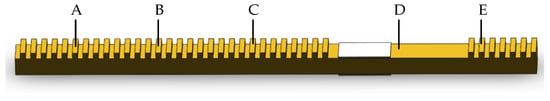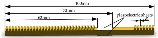 The key parts of the tactile device are the touch beams. Array bars are arranged with the same spacing on the touch beams to create the piezoelectric tactile feedback. Here, they are called the ciliary-like body, which is the main factor that produces tactile differences. One of the touch beams is shown in Figure 2. The left side length of the touch beam with a ciliary-like body is longer than the right side. This is because the location of the area without a ciliary-like body is calculated for mounting the piezoelectric sheets for exciting the expected working mode.