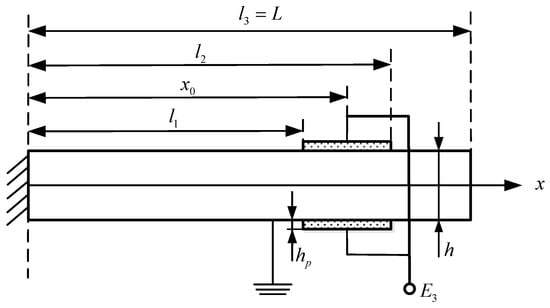 The forced vibration dynamic equations of a touch beam have to be established based on free vibration solution results. In [19], the establishment process and analysis results of the free vibration equation for the ciliary-like body touch beam were released. It was also proved that the ciliary-like body contributes little effect on the dynamic response characteristics by simulation and theoretical methods. Therefore, the ciliary-like body beam can be simplified to behave as a plain beam as shown in Figure 4. Due to the condition of the touch beams where one of the ends is fixed, we consider the boundary condition to be that of the cantilever. The dynamic model of the cantilever touch beam is established, which is divided into three segments: l1, l2, and l3. The piezoelectric piece is attached to x0. The piezoelectric sheets are connected with the driving signals. As the piezoelectric touch beam performs the haptic execution function after the vibration tends to stabilize, the focus here is to analyze the steady-state response of the touch beam.