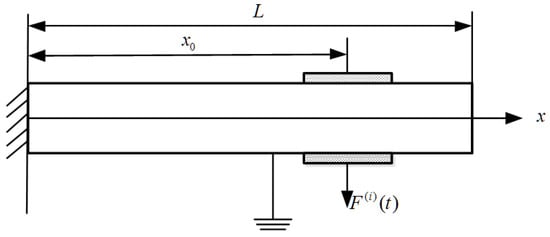 As shown in Figure 5, the cantilever touch beam is subjected to the excitation force f(t) = Feiωt of the piezoelectric sheet at x = x0, and the excitation force of the piezoelectric sheet is regarded as the concentrated excitation force at x = x0. At this time, the concentrated excitation force can be expressed as a distributed force using a unit pulse function whose independent variable is (x − x0). The distributed force generated by the piezoelectric sheet excitation can then be expressed as