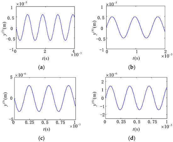 Using the dynamic response equations of the touch beam, numerical simulation analysis can be conducted to reveal the influence of system parameters on its dynamic performance. Here, the excitation voltage is V3 = 100 V, the damping ratio ζ = 0.025, and the position on the beam x = 0.02 m is chosen for the investigation, and the other touch beam and piezoelectric sheet parameters are as shown in Table 1 and Table 2. By substituting each parameter into the above solution formula, the forced response of each order of the touch beam can be obtained. As the natural modes above the 3rd order can form at least one complete harmonic wave, they can be considered to be suitable as working modes of the touch beam. Assuming that the excitation frequency is equal to the natural frequency, the 3rd~6th order forced response curves are solved as shown in Figure 6. Assuming that the excitation frequency is equal to the natural frequency, the 1st and 2nd order vibration modes do not show a good periodic change in the mode shapes, so the 3rd–6th order forced response curves are solved.