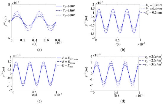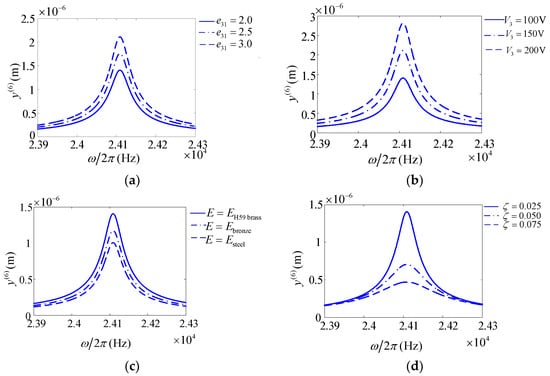 The four key electromechanical parameters of the touch beam were selected to draw the relevant forced response curve with the excitation frequency close to the natural frequency of the 6th order, which is suitable as a working frequency. The forced response changes with three different values corresponding to the four parameters that can be obtained as shown in Figure 7. The four parameters investigated are excitation voltage V3, piezoelectric sheet thickness hp, touch beam elastic modulus E, and piezoelectric coefficient e31.