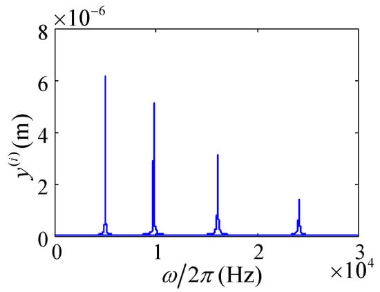 Using Equation (22) of the theoretical derivation results, the frequency-domain response of the cantilever touching beam is solved by using MATLAB and the related curves are drawn. The 3rd–6th order frequency domain response of the touch beam is shown in Figure 8. From left to right are the 3rd, 4th, 5th, and 6th order frequency domain responses.