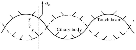 According to the introduction of the principle, the modulation of the friction coefficient is determined by the inertial force when the ciliary-like body vibrates, and then the strength of inertial force is determined by the vibration acceleration, though the real-time acceleration of the ciliary-like body’s vibration acts on the skin intermittently. Therefore, we need to establish the average acceleration acting on the skin. As shown in Figure 10, the touch beam moves from the dotted line to the solid line, and the ciliary-like body acts on the finger in half a cycle. As the vibration frequency of the touch beam is large and the period is extremely short, the variable acceleration motion of the ciliary-like body can be approximated as a uniform acceleration motion, so each ciliary-like body takes an average acceleration of half a vibration period. At the i order vibration frequency, the average ciliary-like body acceleration with position coordinate xj can be expressed as