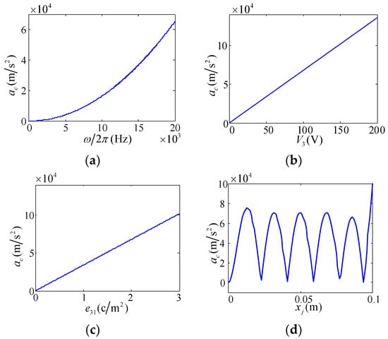 In order to further study the effect of the ciliary-like body on the equivalent friction coefficient, it is necessary to analyze the functional relationship between the average acceleration of the ciliary-like body and the system parameters. The parameters are the same as those in Table 1 and Table 2. In the case of the structure of the touch beam, the relationship between the vibration acceleration ac of the ciliary-like body and the excitation frequency ω, the excitation voltage amplitude V3, the piezoelectric coefficient e31, and the position coordinate xj is shown in Figure 11.