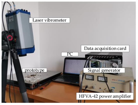 The touch beam with the ciliary-like body structure of the groove ε = 1 mm is taken as the experimental object. In order to determine the vibration behavior of the whole touch beam as a function of the position coordinate, the vibration modes of the touching beam were measured for various locations of the sampling point. The touch beam was driven by a sinusoidal signal with a voltage peak of 100 V. The experimental environment is shown in Figure 12.